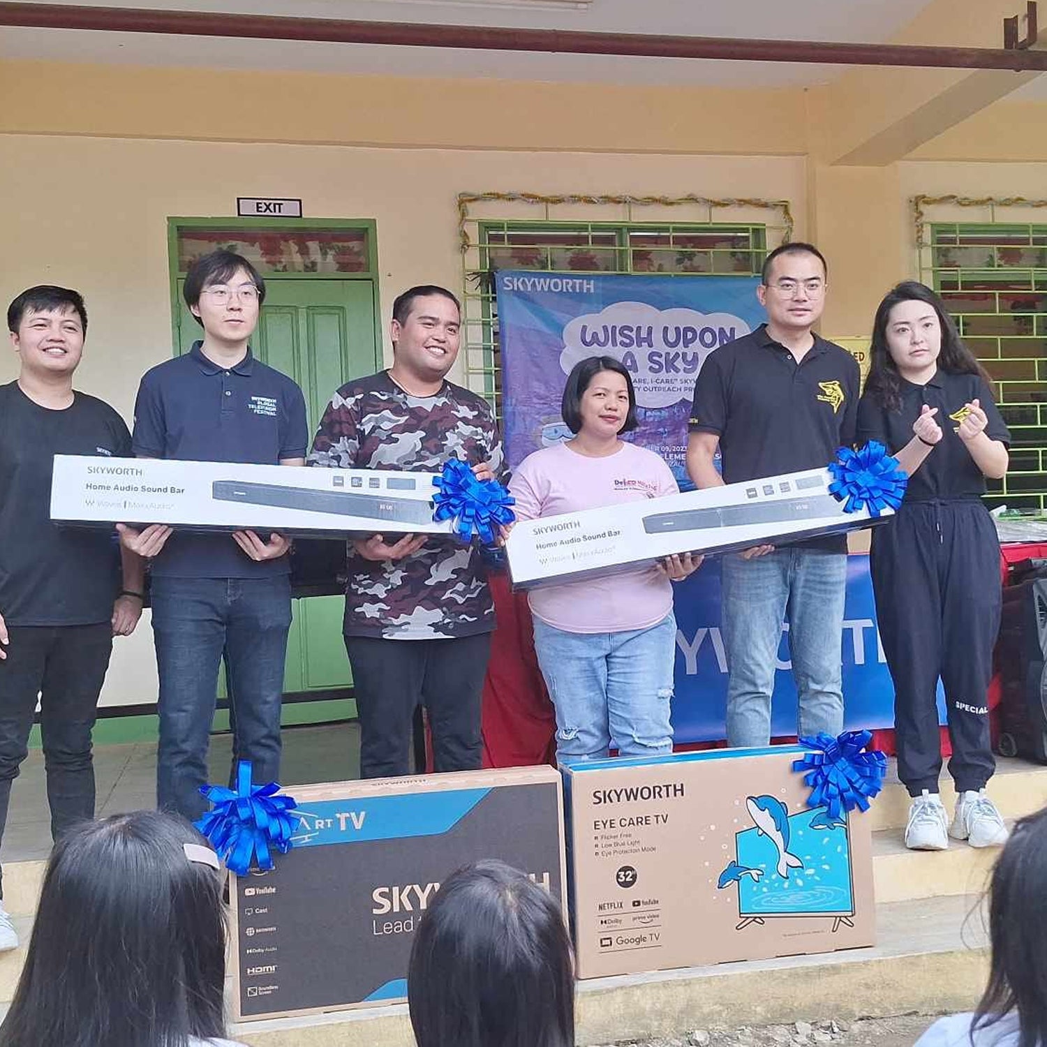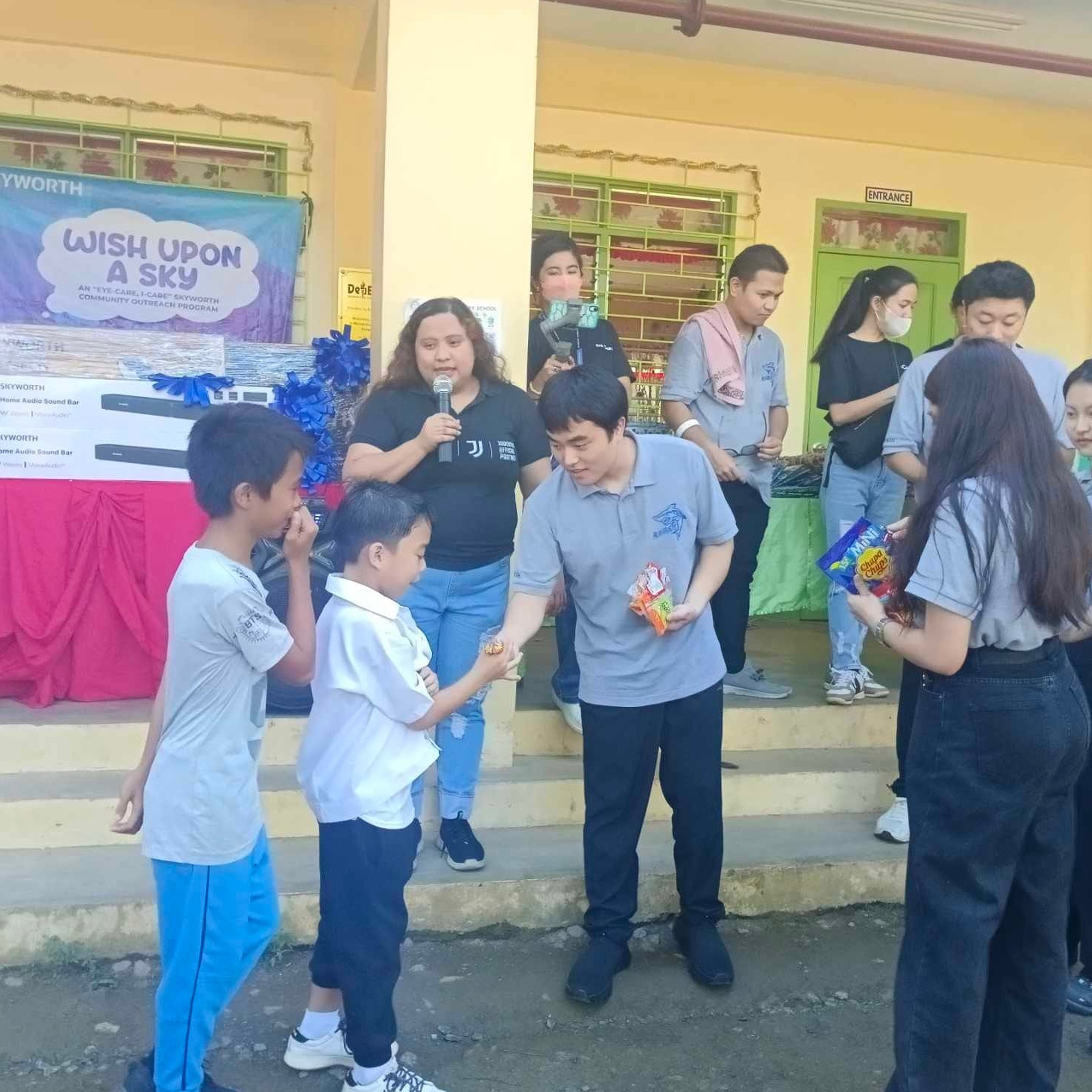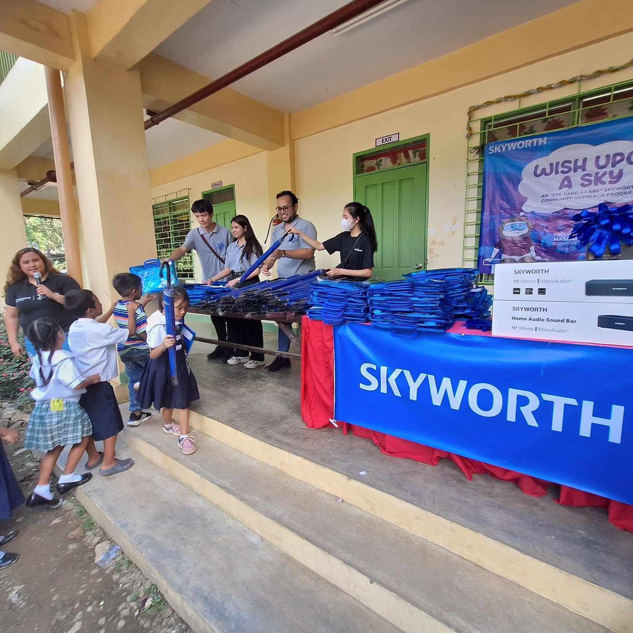 Skyworth Philippines' donated 2 Smart TVs at Mascap Elementary School as part of the Wish Upon A SKY Project. Together with the home entertainment products are sets of School Supplies with umbrella, food packs and Christmas Gifts.